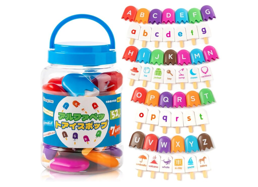 このアルファベットアイスポップは、遊びながらアルファベットやフォニックスを覚えられる英語教材です。